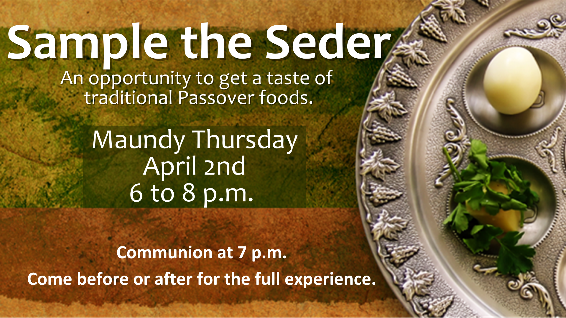 Sample the Seder: 6:00 to 8:00 p.m., Communion Service at 7:00 p.m.